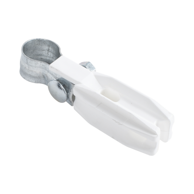 Aislador de paso o esquina con abrazadera de 1′ diametro para uso en poste de cerca electrica.